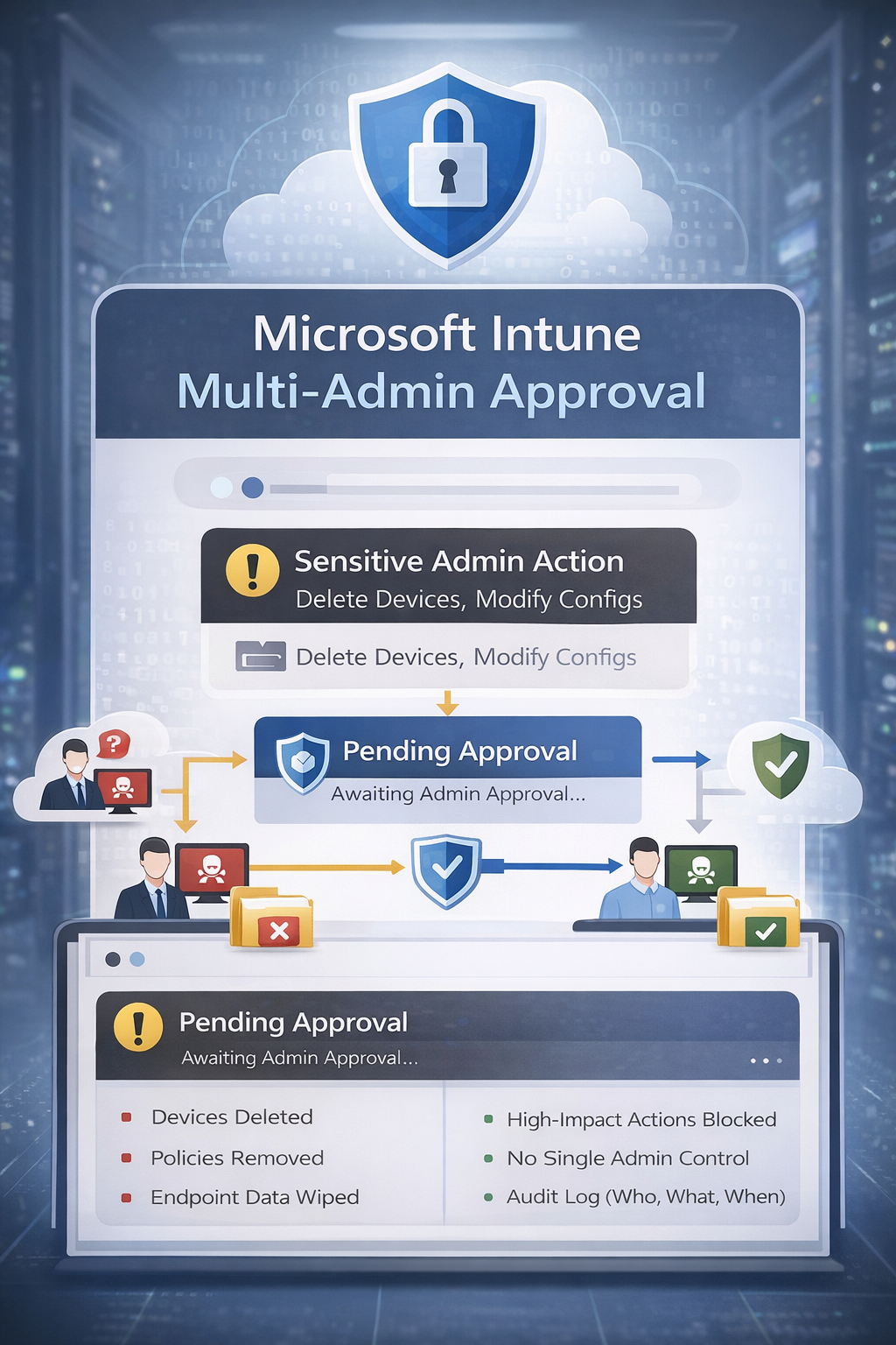 Microsoft Intune Multi-Admin Approval workflow showing request submission and approval process for sensitive administrative actions